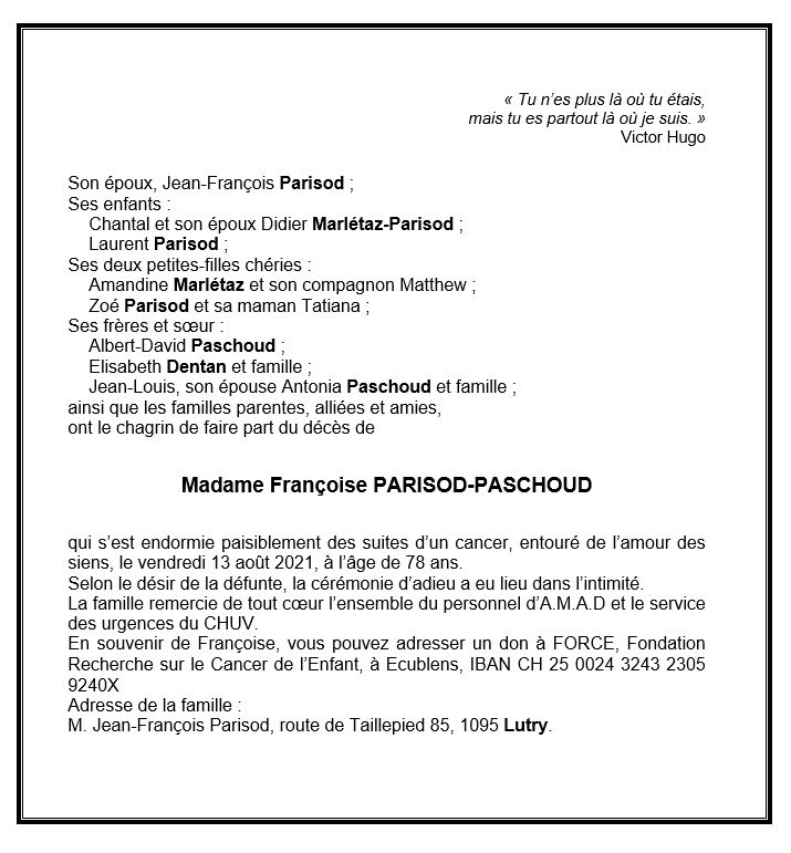 Madame Françoise PARISOD-PASCHOUD 07 mar. 1943 - 13 aoû. 2021 Avis mortuaire PFG Télecharger PDF Partager sur: Galerie PreviousNext PreviousNext