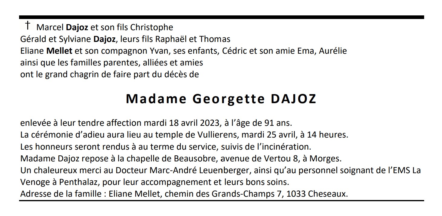 Madame Georgette DAJOZ 09 avr. 1932 - 18 avr. 2023 Avis mortuaire PFG Télecharger PDF Partager sur: Galerie PreviousNext PreviousNext