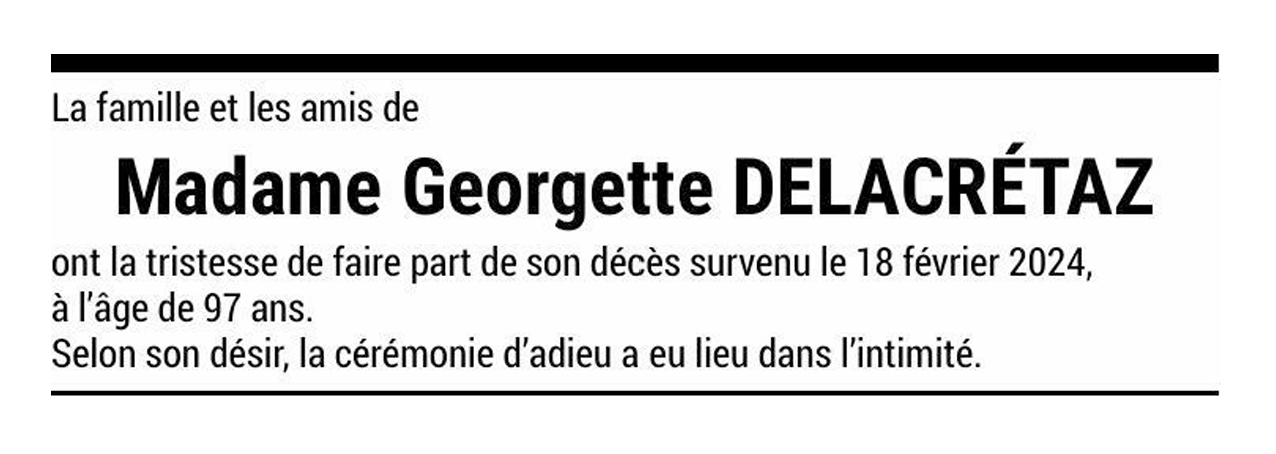 Madame Georgette DELACRÉTAZ 17 sep. 1926 - 18 fév. 2024 Avis mortuaire PFG Télecharger PDF Partager sur: Galerie