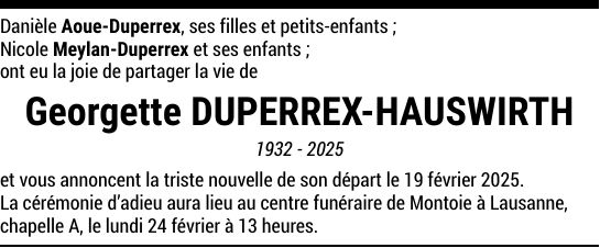 Madame Georgette DUPERREX-HAUSWIRTH 28 mai. 1932 - 19 fév. 2025 Avis mortuaire PFG Partager sur: Galerie