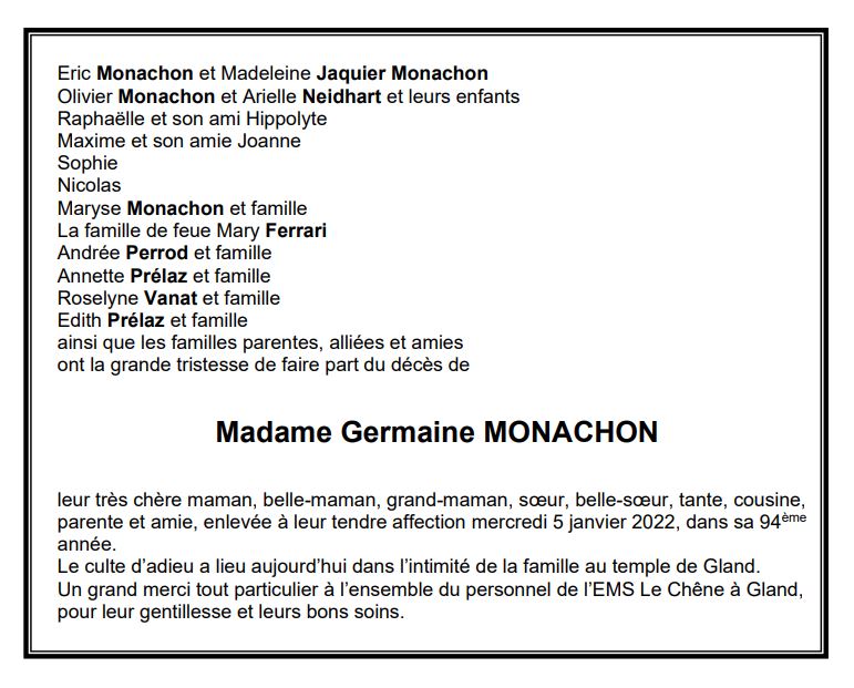 Madame Germaine MONACHON 31 juil. 1928 - 05 jan. 2022 Avis mortuaire PFG Télecharger PDF Partager sur: Galerie PreviousNext PreviousNext