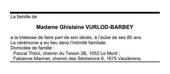 Madame Ghislaine VURLOD-BARBEY 19 aoû. 1937 - 17 aoû. 2022 Avis mortuaire PFG Télecharger PDF Partager sur: Galerie PreviousNext PreviousNext