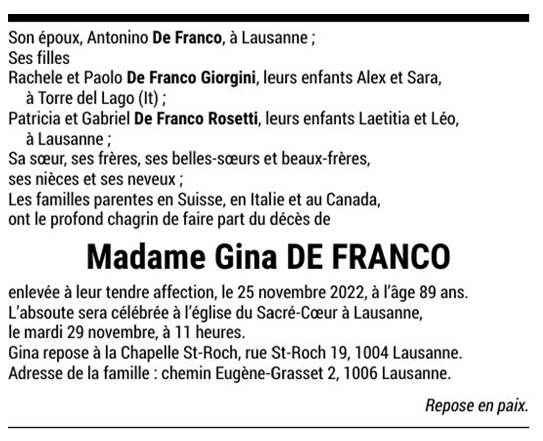 Madame Gina DE FRANCO 07 mar. 1933 - 25 nov. 2022 Avis mortuaire PFG Télecharger PDF Partager sur: Galerie PreviousNext PreviousNext