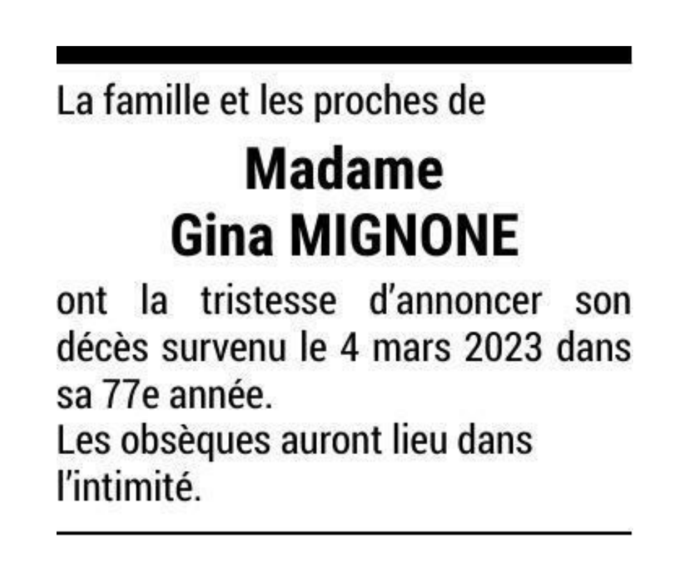 Madame Gina MIGNONE 12 sep. 1946 - 04 mar. 2023 Avis mortuaire PFG Télecharger PDF Partager sur: Galerie PreviousNext PreviousNext