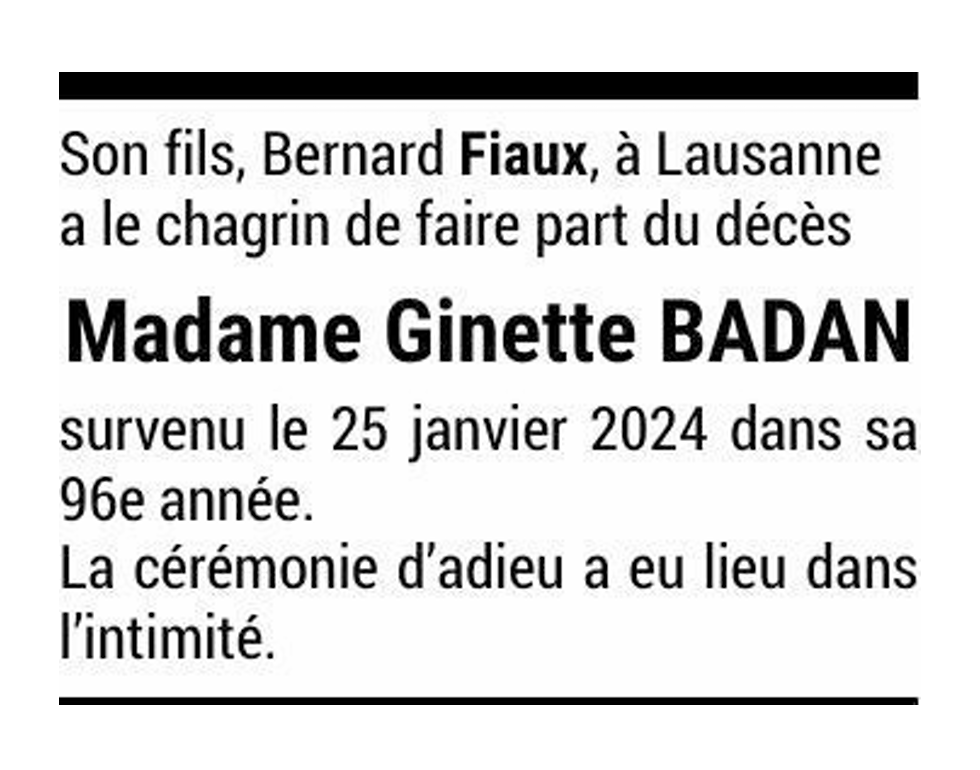 Madame Ginette BADAN 08 fév. 1928 - 25 jan. 2024 Avis mortuaire PFG Télecharger PDF Partager sur: Galerie PreviousNext PreviousNext