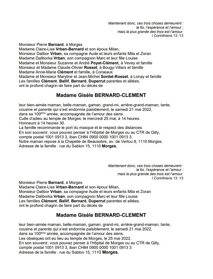 Madame Gisèle BERNARD-CLEMENT 28 oct. 1922 - 21 mai. 2022 Avis mortuaire PFG Télecharger PDF Partager sur: Galerie PreviousNext PreviousNext