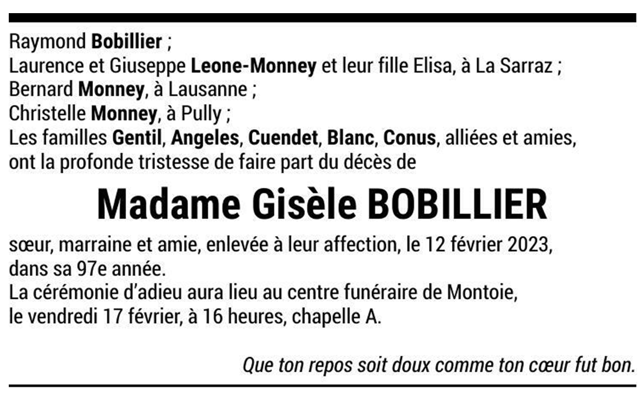 Madame Gisèle BOBILLIER 04 aoû. 1926 - 12 fév. 2023 Avis mortuaire PFG Télecharger PDF Partager sur: Galerie PreviousNext PreviousNext
