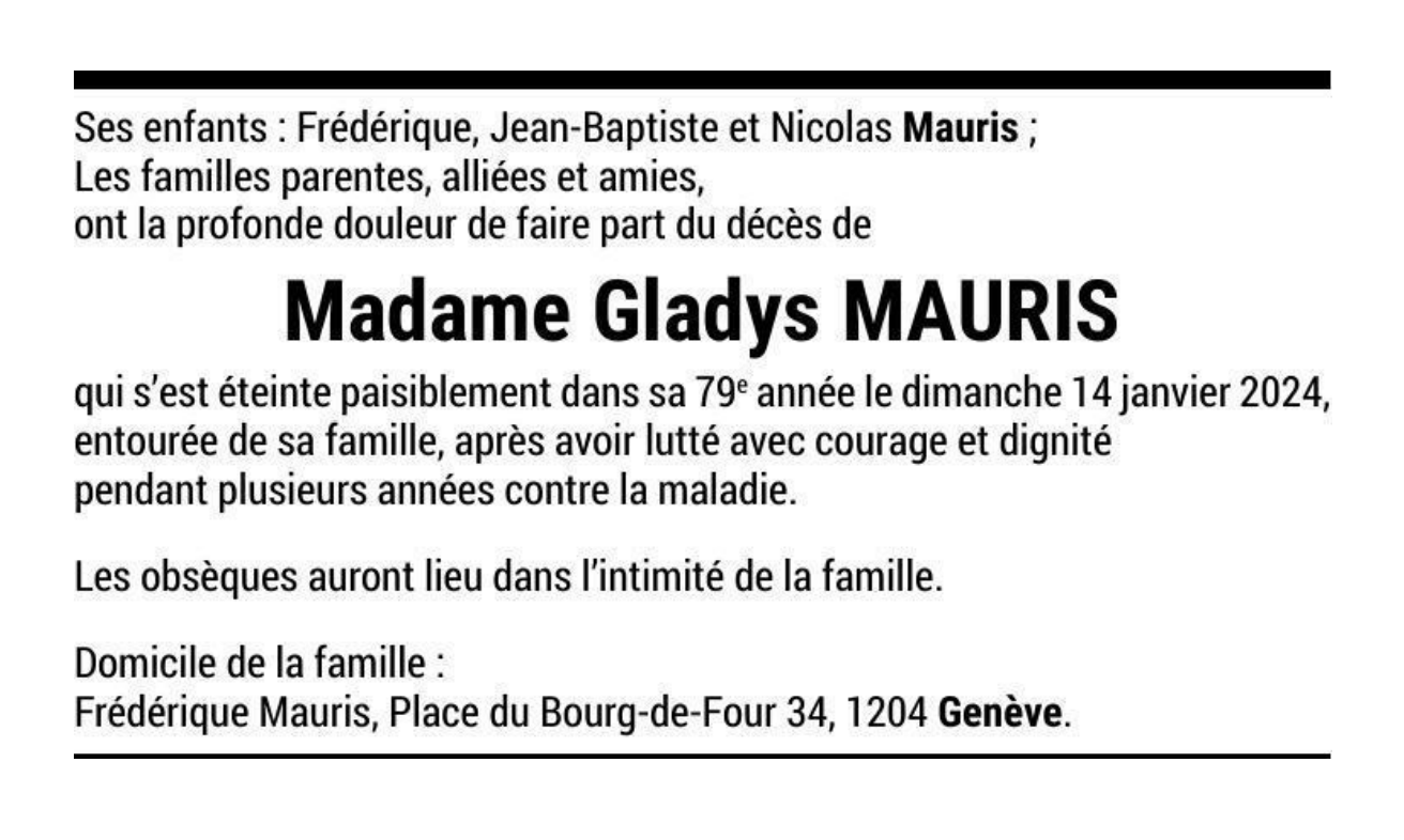 Madame Gladys MAURIS 08 avr. 1945 - 14 jan. 2024 Avis mortuaire PFG Télecharger PDF Partager sur: Galerie PreviousNext PreviousNext