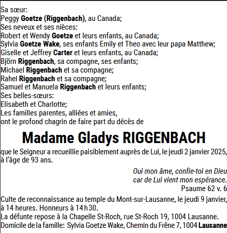 Madame Gladys RIGGENBACH 21 nov. 1931 - 02 jan. 2025 Avis mortuaire PFG Télecharger PDF Partager sur: Galerie PreviousNext PreviousNext