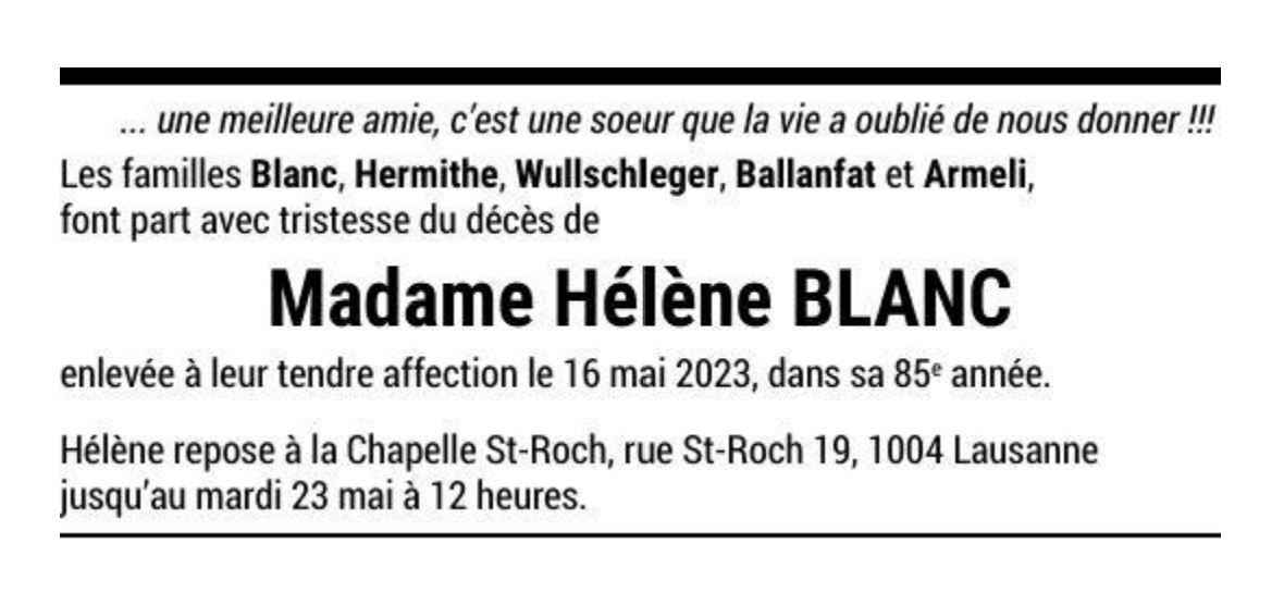 Madame Hélène BLANC 09 mar. 1939 - 16 mai. 2023 Avis mortuaire PFG Télecharger PDF Partager sur: Galerie PreviousNext PreviousNext