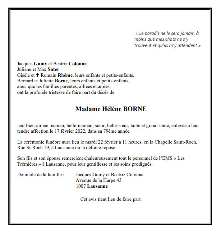 Madame Hélène BORNE 29 avr. 1943 - 17 fév. 2022 Avis mortuaire PFG Télecharger PDF Partager sur: Galerie PreviousNext PreviousNext