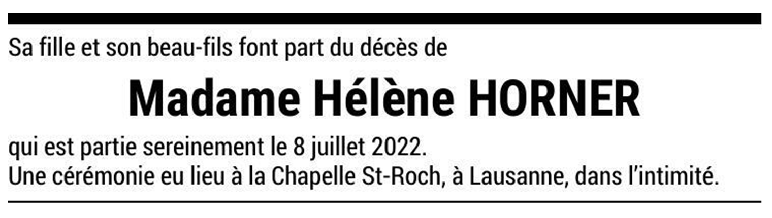 Madame Hélène HORNER 02 avr. 1936 - 08 juil. 2022 Avis mortuaire PFG Télecharger PDF Partager sur: Galerie PreviousNext PreviousNext