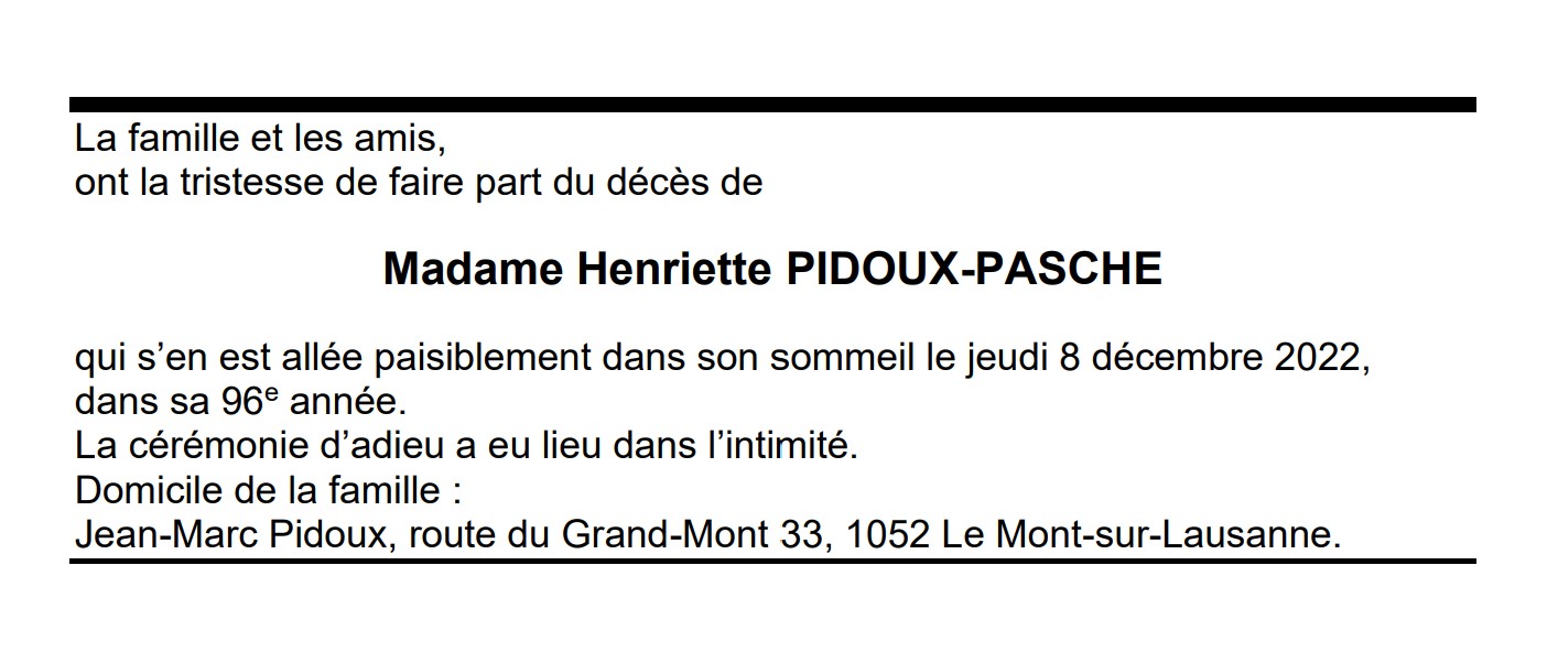Madame Henriette PIDOUX-PASCHE 10 fév. 1927 - 08 déc. 2022 Avis mortuaire PFG Télecharger PDF Partager sur: Galerie PreviousNext PreviousNext