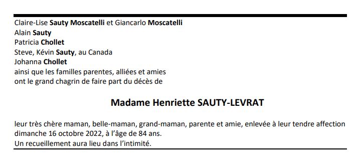 Madame Henriette SAUTY-LEVRAT 23 juin. 1938 - 16 oct. 2022 Avis mortuaire PFG Télecharger PDF Partager sur: Galerie PreviousNext PreviousNext