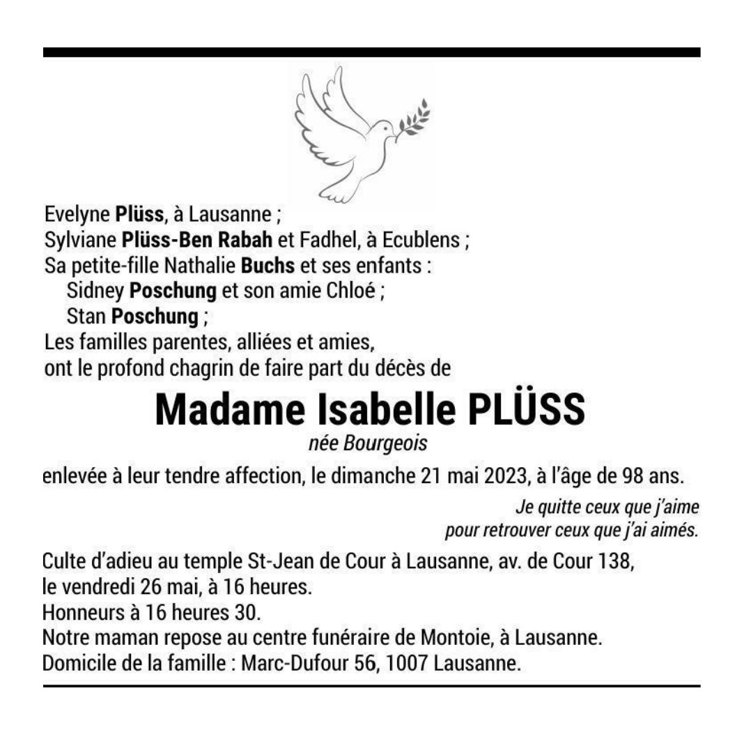 Madame Isabelle PLÜSS née Bourgeois 19 mai. 1925 - 21 mai. 2023 Avis mortuaire PFG Télecharger PDF Partager sur: Galerie PreviousNext PreviousNext