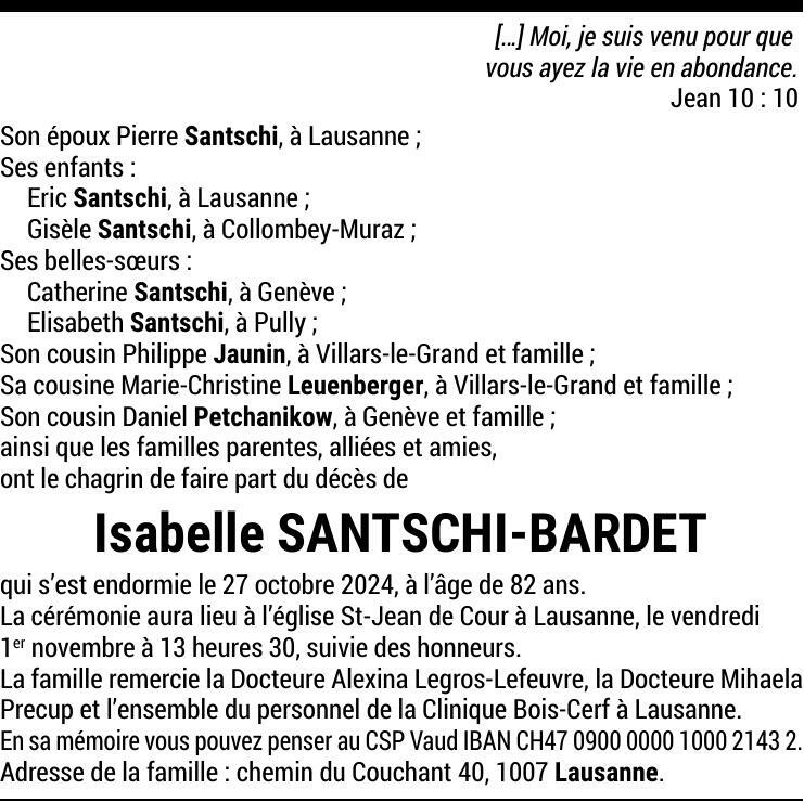 Madame Isabelle SANTSCHI-BARDET 04 oct. 1942 - 27 oct. 2024 Avis mortuaire PFG Partager sur: Galerie PreviousNext PreviousNext