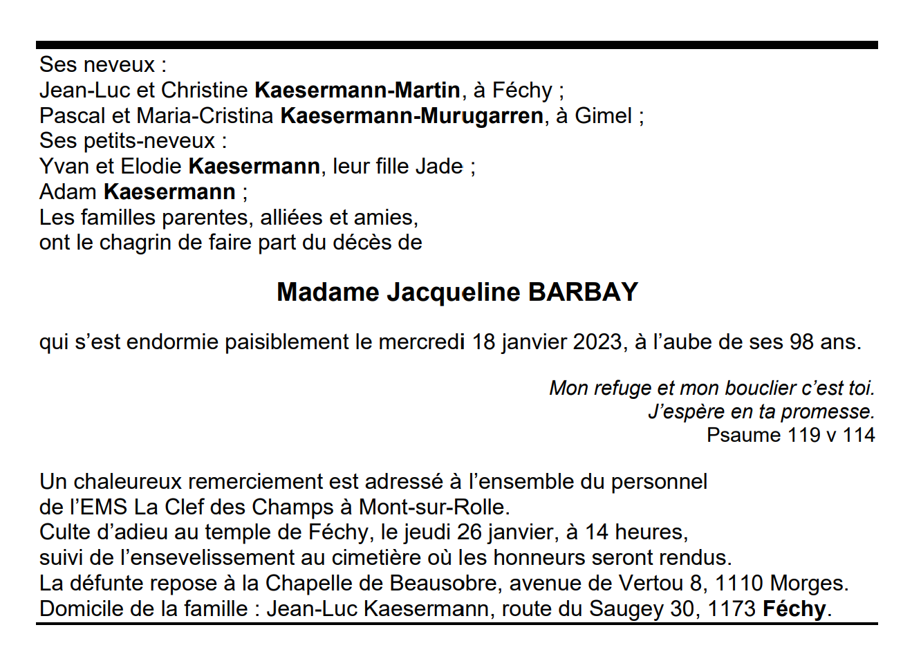 Madame Jacqueline BARBAY 28 jan. 1925 - 18 jan. 2023 Avis mortuaire PFG Télecharger PDF Partager sur: Galerie PreviousNext PreviousNext