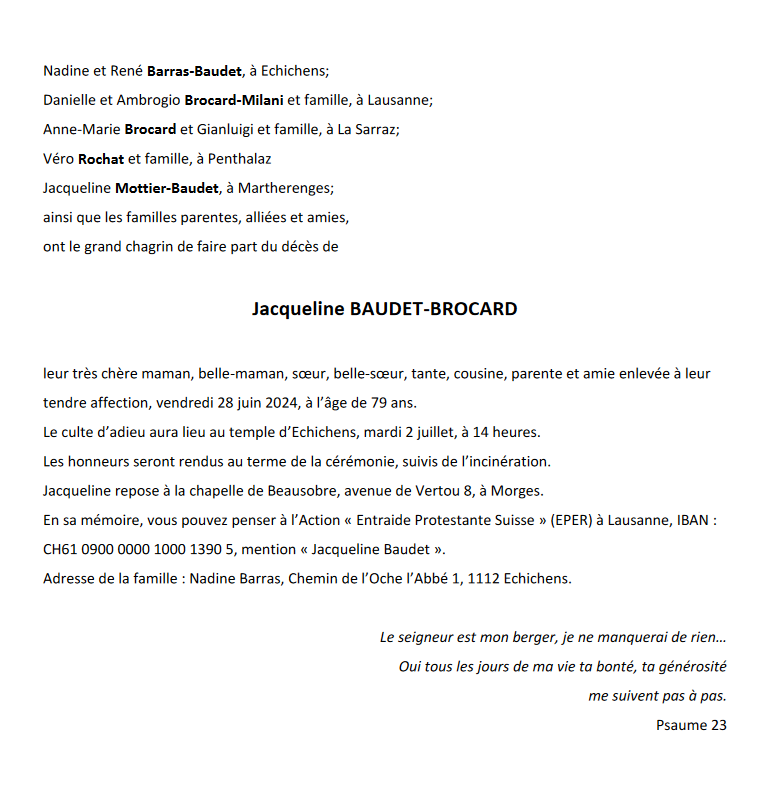 Madame Jacqueline BAUDET-BROCARD 29 avr. 1945 - 28 juin. 2024 Avis mortuaire PFG Télecharger PDF Partager sur: Galerie PreviousNext PreviousNext