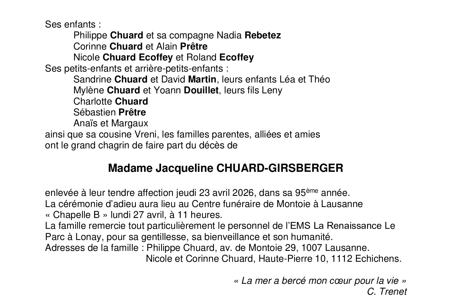 Madame Jacqueline CHUARD