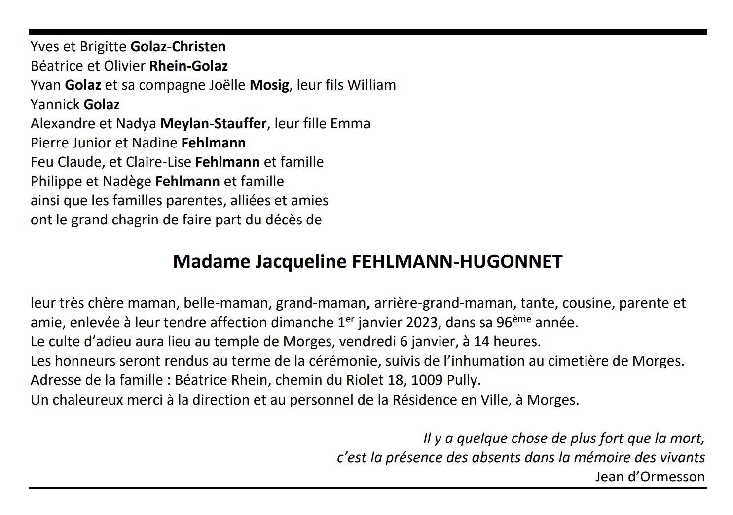 Madame Jacqueline FEHLMANN-HUGONNET 05 jan. 1927 - 01 jan. 2023 Avis mortuaire PFG Télecharger PDF Partager sur: Galerie PreviousNext PreviousNext