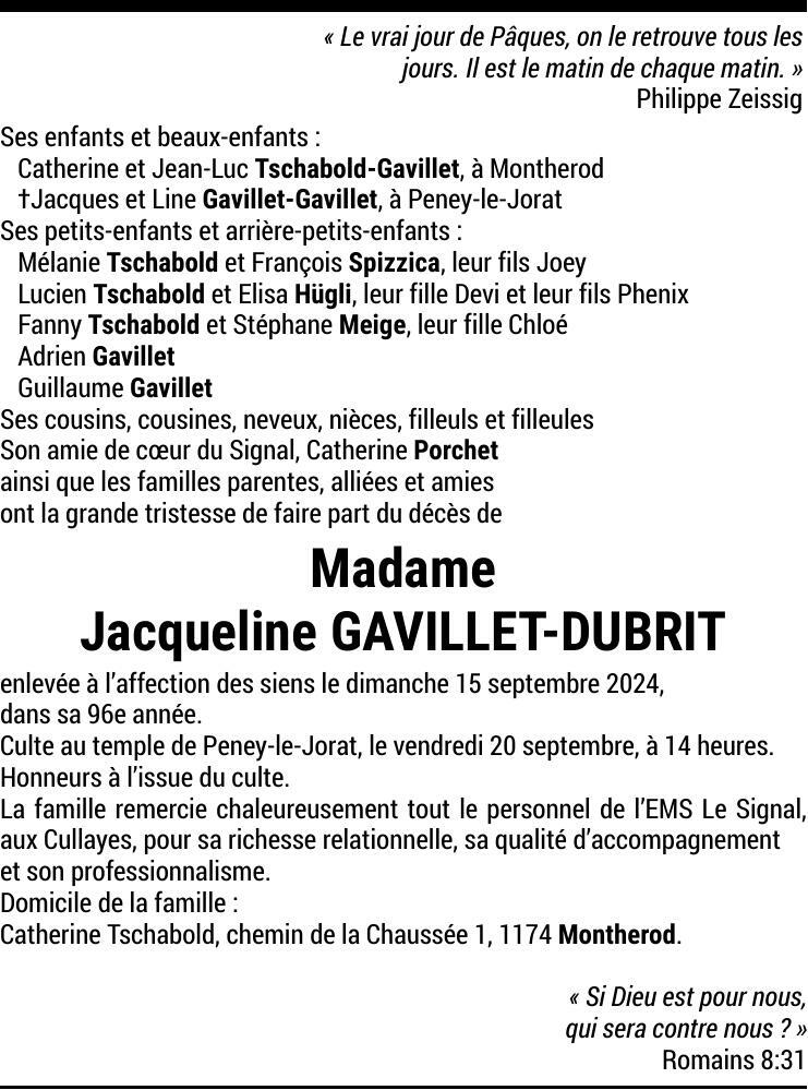 Madame Jacqueline GAVILLET-DUBRIT 15 déc. 1928 - 15 sep. 2024 Avis mortuaire PFG Partager sur: Galerie