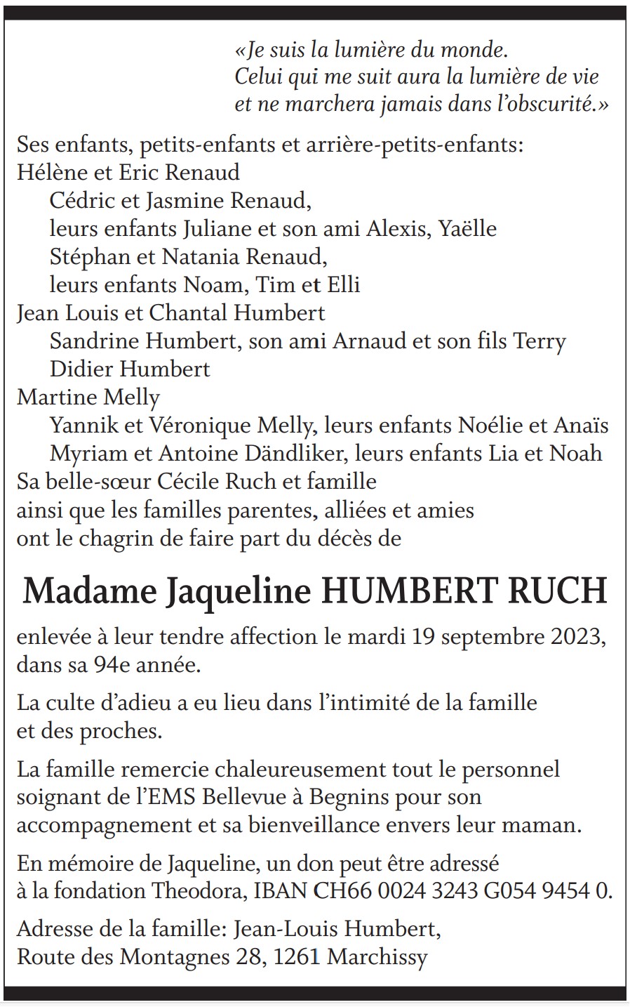 Madame Jacqueline HUMBERT RUCH 01 avr. 1930 - 19 sep. 2023 Avis mortuaire PFG Télecharger PDF Partager sur: Galerie PreviousNext PreviousNext