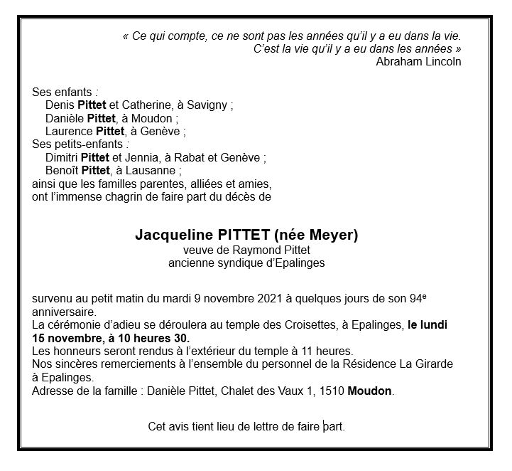 Madame Jacqueline PITTET 22 nov. 1927 - 09 nov. 2021 Avis mortuaire PFG Télecharger PDF Partager sur: Galerie PreviousNext PreviousNext