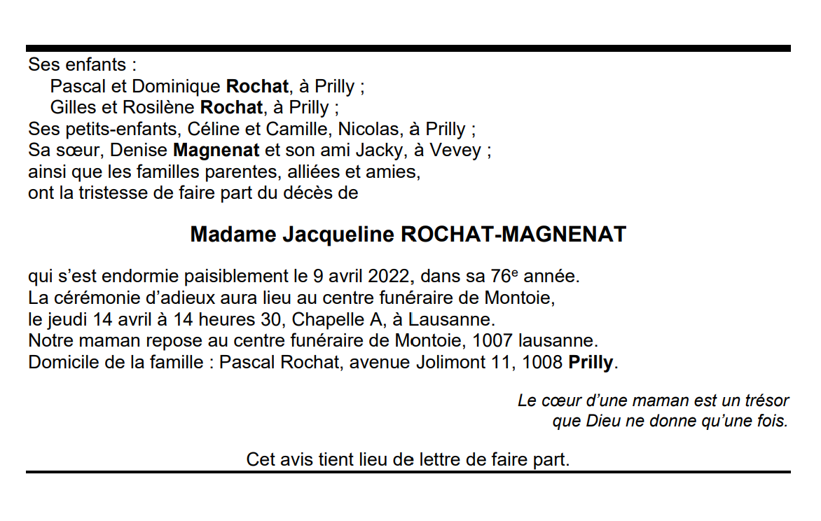 Madame Jacqueline ROCHAT-MAGNENAT 02 mai. 1946 - 09 avr. 2022 Avis mortuaire PFG Télecharger PDF Partager sur: Galerie PreviousNext PreviousNext