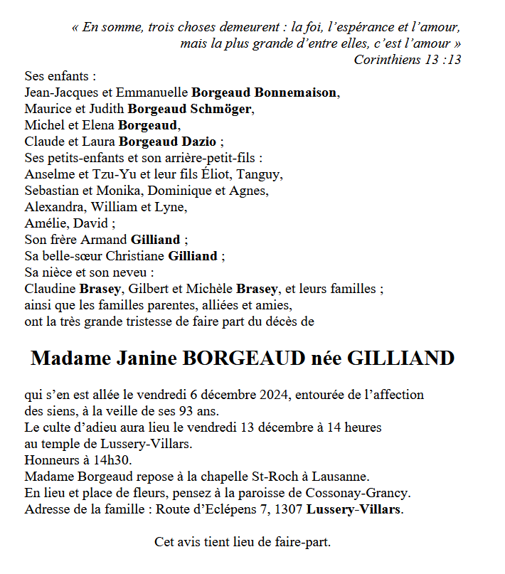 Madame Janine BORGEAUD née GILLIAND 21 déc. 1931 - 06 déc. 2024 Avis mortuaire PFG Télecharger PDF Partager sur: Galerie