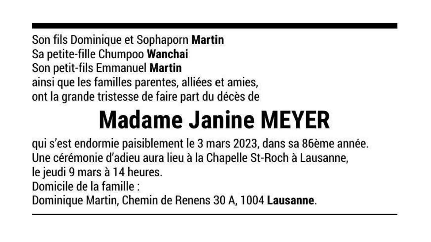 Madame Janine MEYER 29 nov. 1937 - 03 mar. 2023 Avis mortuaire PFG Télecharger PDF Partager sur: Galerie PreviousNext PreviousNext
