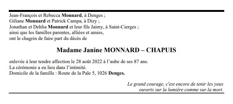 Madame Janine MONNARD – CHAPUIS 10 oct. 1935 - 28 aoû. 2022 Avis mortuaire PFG Télecharger PDF Partager sur: Galerie PreviousNext PreviousNext