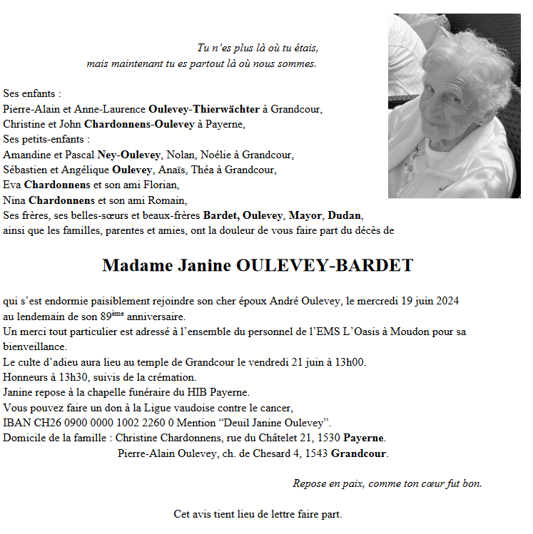 Madame Janine OULEVEY-BARDET 17 juin. 1935 - 19 juin. 2024 Avis mortuaire PFG Télecharger PDF Partager sur: Galerie PreviousNext PreviousNext