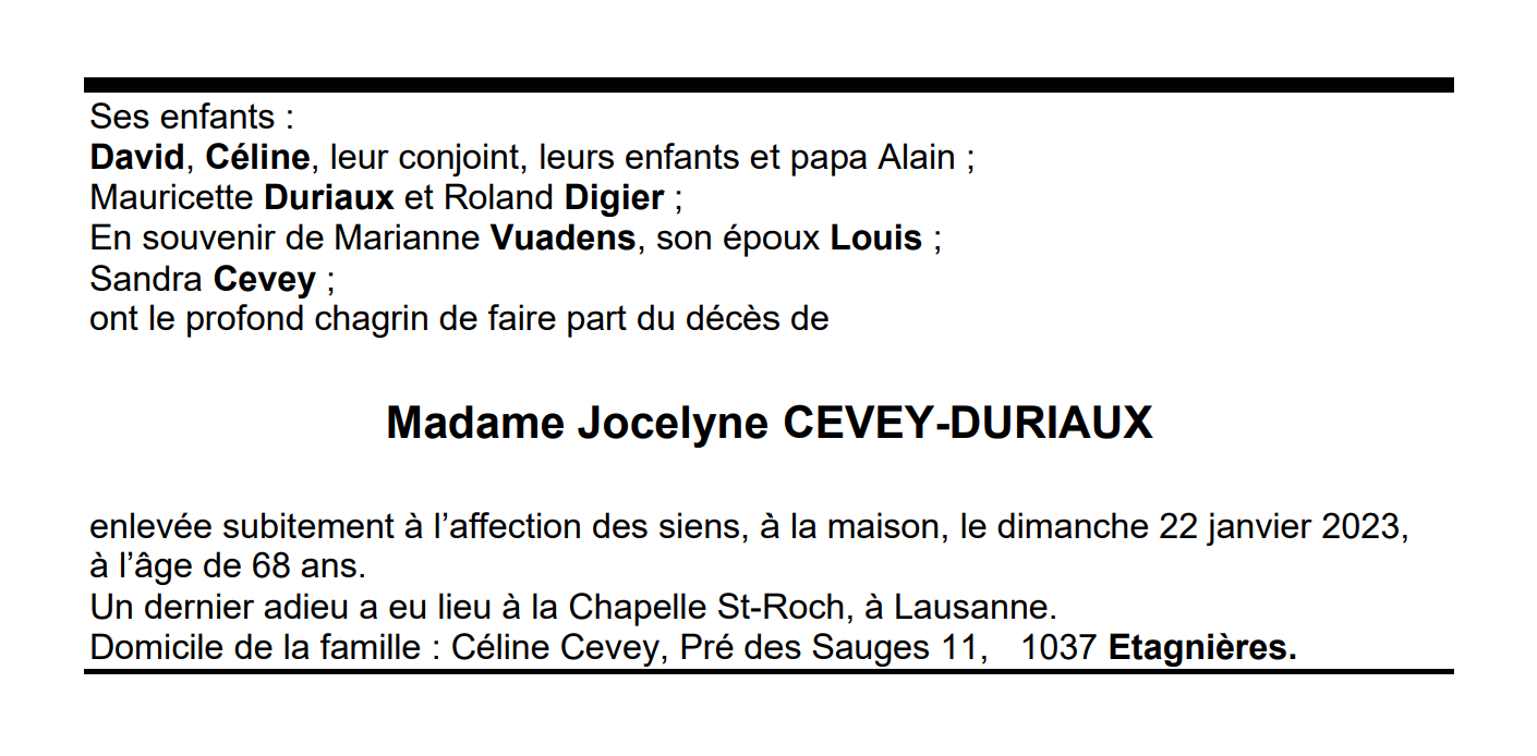 Madame Jocelyne CEVEY-DURIAUX 07 jan. 1955 - 22 jan. 2023 Avis mortuaire PFG Télecharger PDF Partager sur: Galerie PreviousNext PreviousNext