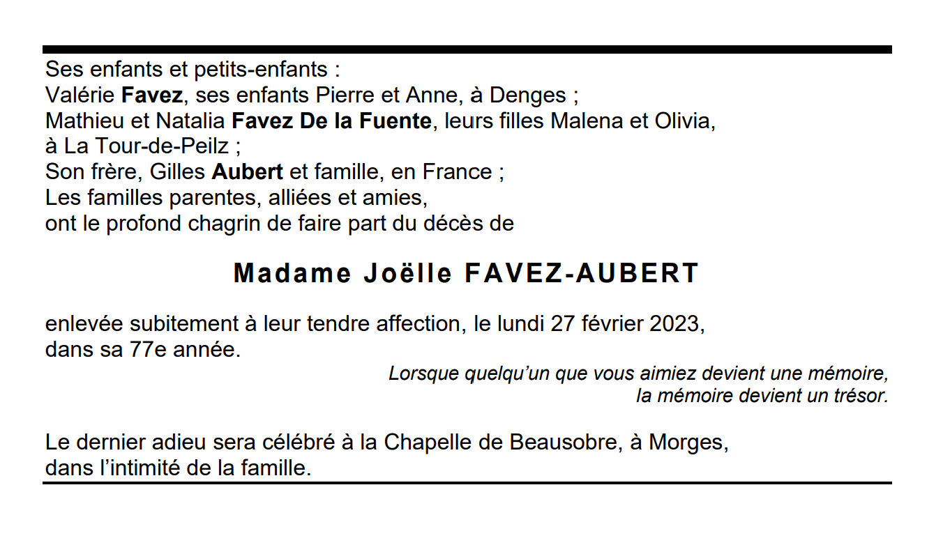 Madame Joëlle FAVEZ-AUBERT 04 mai. 1946 - 27 fév. 2023 Avis mortuaire PFG Télecharger PDF Partager sur: Galerie PreviousNext PreviousNext