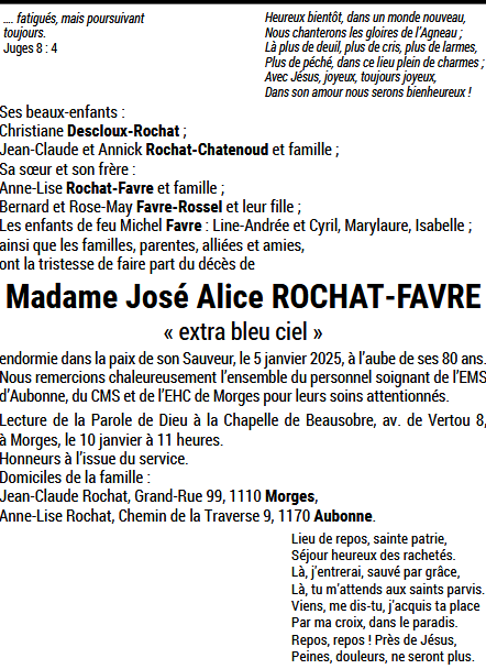 Madame José Alice ROCHAT-FAVRE 08 avr. 1945 - 05 jan. 2024 Avis mortuaire PFG Télecharger PDF Partager sur: Galerie