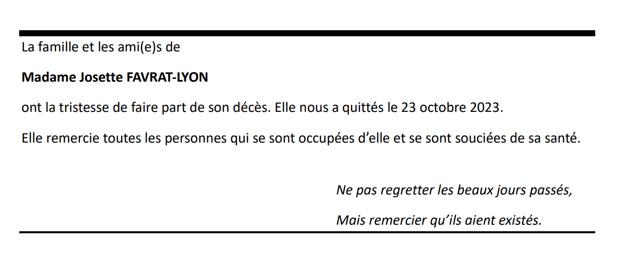 Madame Josette FAVRAT-LYON 23 oct. 2023 Avis mortuaire PFG Télecharger PDF Partager sur: Galerie PreviousNext PreviousNext