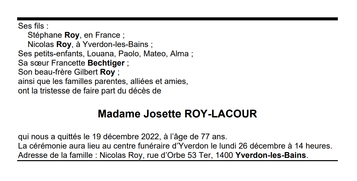 Madame Josette ROY-LACOUR 20 mar. 1945 - 19 déc. 2022 Avis mortuaire PFG Télecharger PDF Partager sur: Galerie PreviousNext PreviousNext