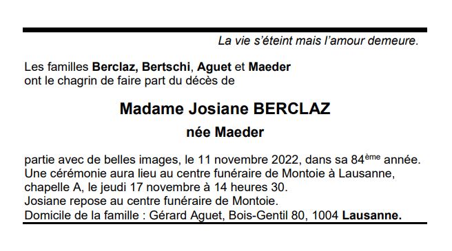Madame Josiane BERCLAZ 14 aoû. 1939 - 11 nov. 2022 Avis mortuaire PFG Télecharger PDF Partager sur: Galerie PreviousNext PreviousNext