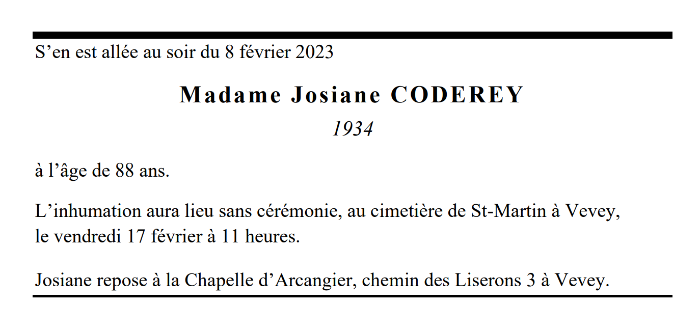 Madame Josiane CODEREY 28 avr. 1934 - 08 fév. 2023 Avis mortuaire PFG Télecharger PDF Partager sur: Galerie PreviousNext PreviousNext