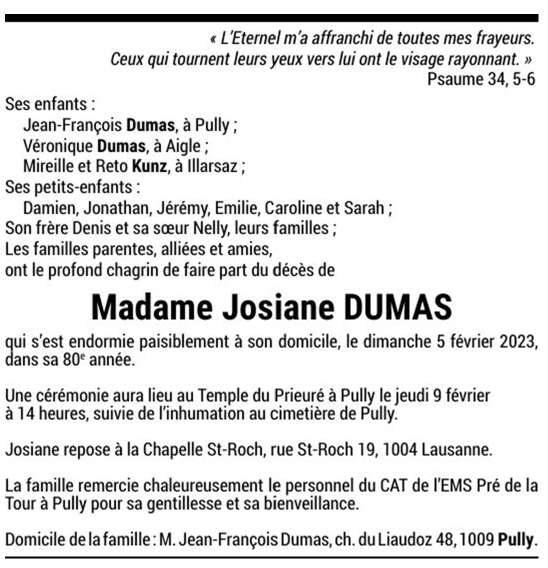 Madame Josiane DUMAS 27 sep. 1943 - 05 fév. 2023 Avis mortuaire PFG Télecharger PDF Partager sur: Galerie PreviousNext PreviousNext