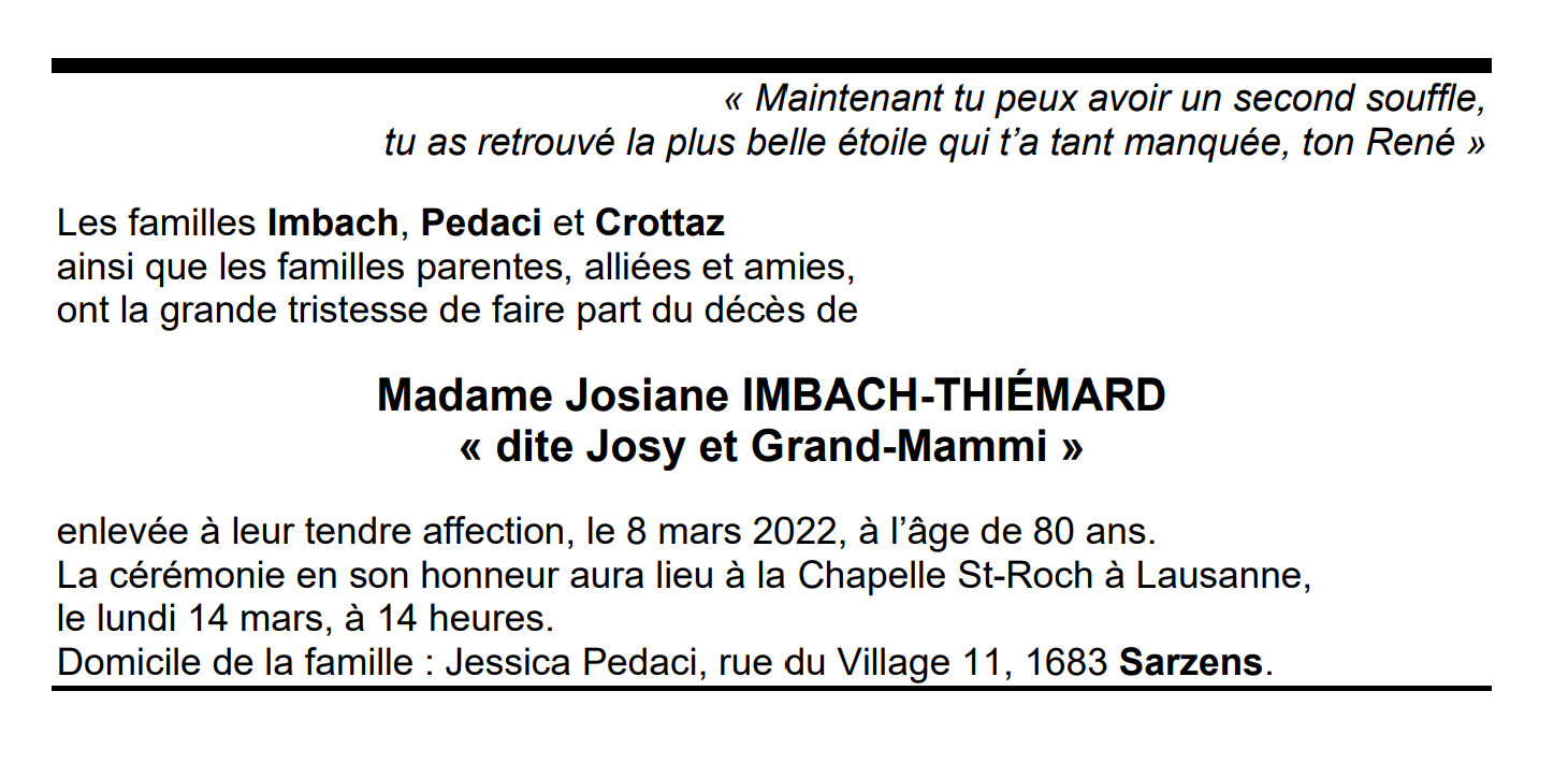 Madame Josiane IMBACH-THIÉMARD 26 fév. 1942 - 08 mar. 2022 Avis mortuaire PFG Télecharger PDF Partager sur: Galerie PreviousNext PreviousNext