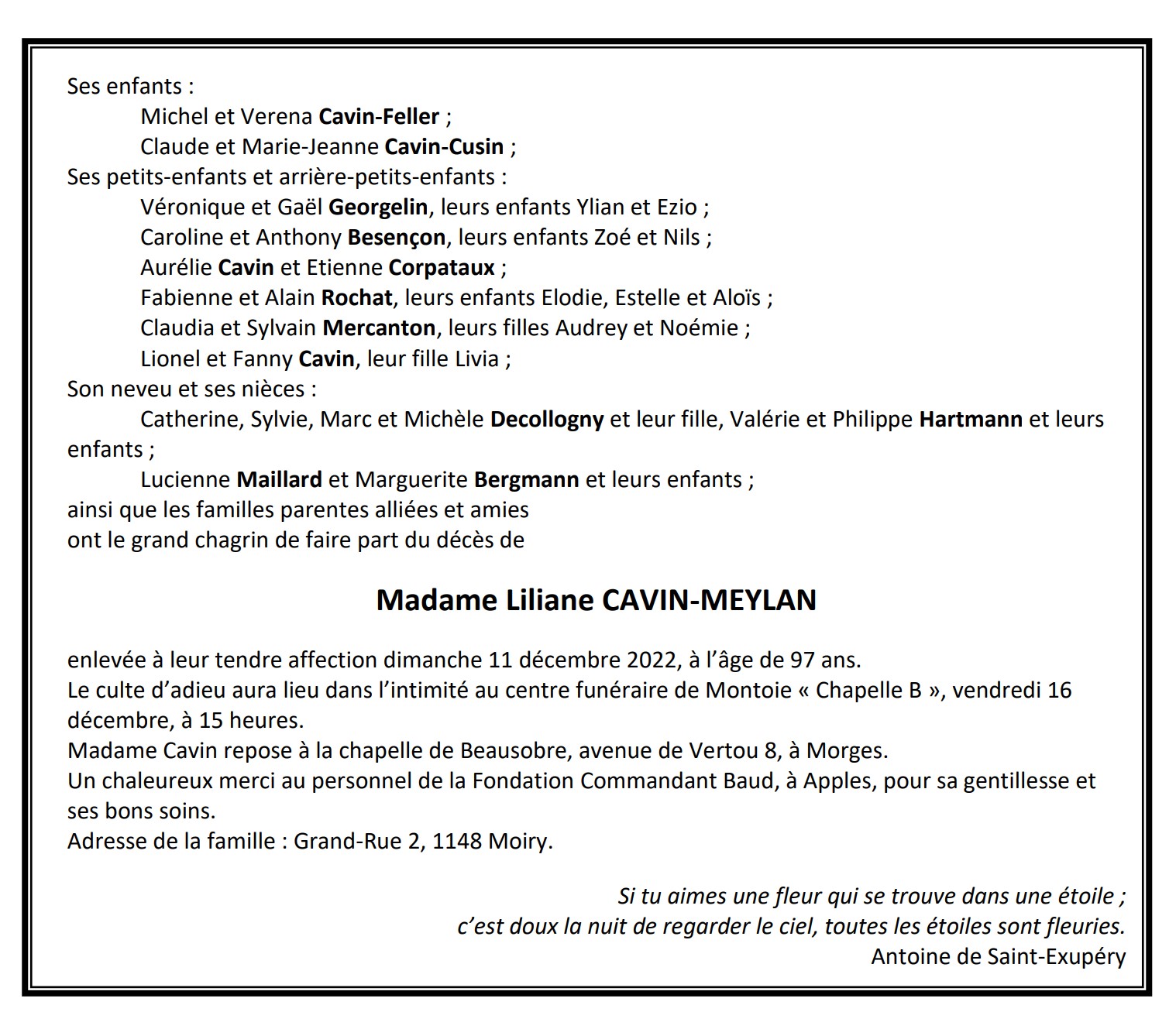 Madame Liliane CAVIN-MEYLAN 20 juin. 1925 - 11 déc. 2022 Avis mortuaire PFG Télecharger PDF Partager sur: Galerie PreviousNext PreviousNext
