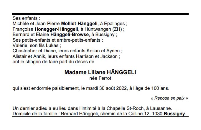 Madame Liliane HÄNGGELI 09 aoû. 1922 - 30 aoû. 2022 Avis mortuaire PFG Télecharger PDF Partager sur: Galerie PreviousNext PreviousNext