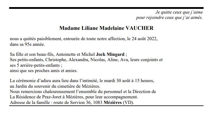 Madame Liliane Madelaine VAUCHER 17 jan. 1928 - 24 aoû. 2022 Avis mortuaire PFG Télecharger PDF Partager sur: Galerie PreviousNext PreviousNext