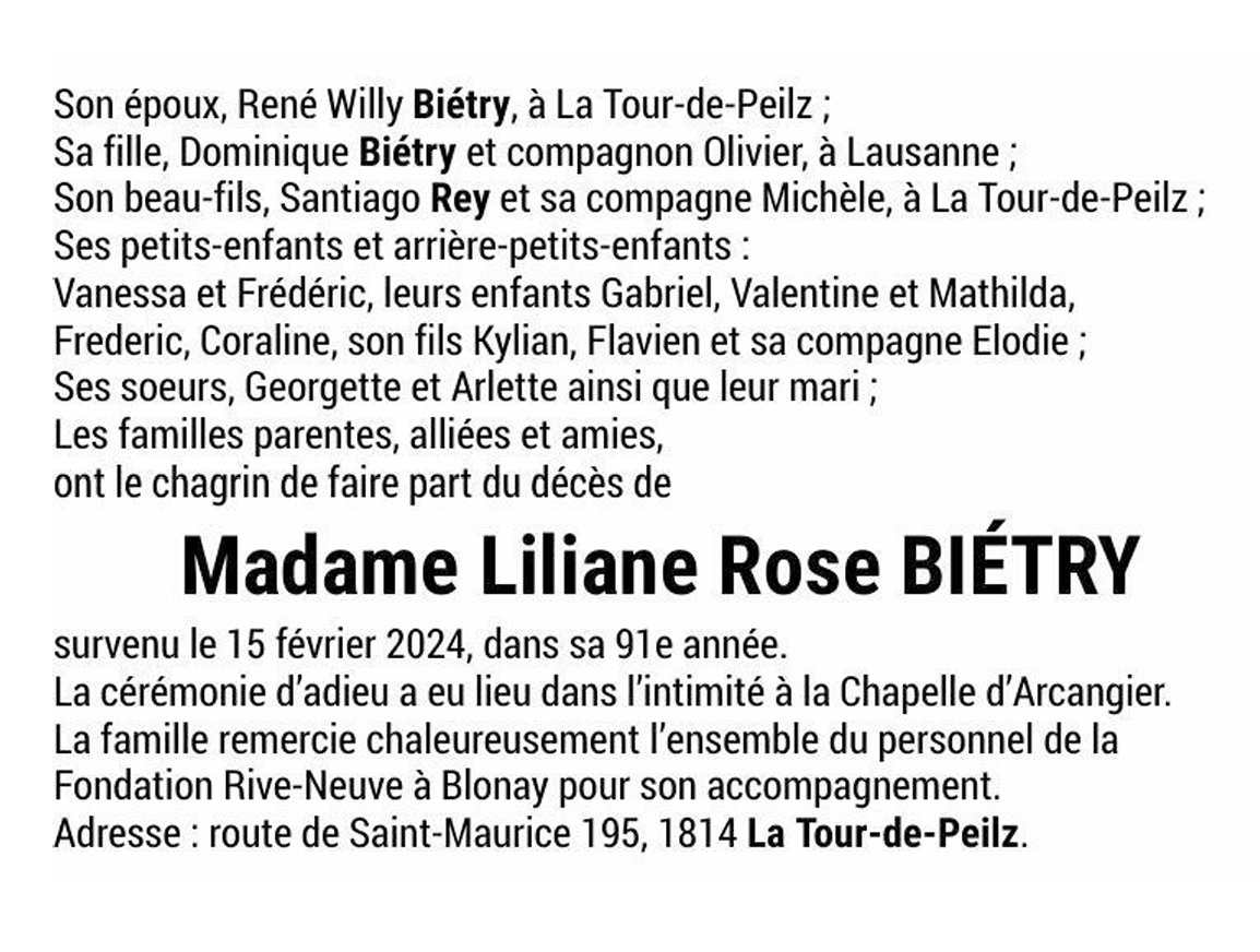 Madame Liliane Rose BIÉTRY 09 aoû. 1933 - 15 fév. 2024 Avis mortuaire PFG Télecharger PDF Partager sur: Galerie PreviousNext PreviousNext