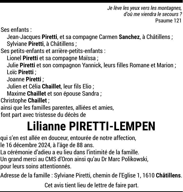 Madame Lilianne PIRETTI-LEMPEN 23 juil. 1936 - 16 déc. 2024 Avis mortuaire PFG Partager sur: Galerie PreviousNext PreviousNext