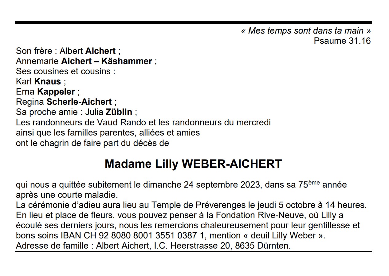 Madame Lilly WEBER-AICHERT 14 déc. 1948 - 24 sep. 2023 Avis mortuaire PFG Télecharger PDF Partager sur: Galerie PreviousNext PreviousNext