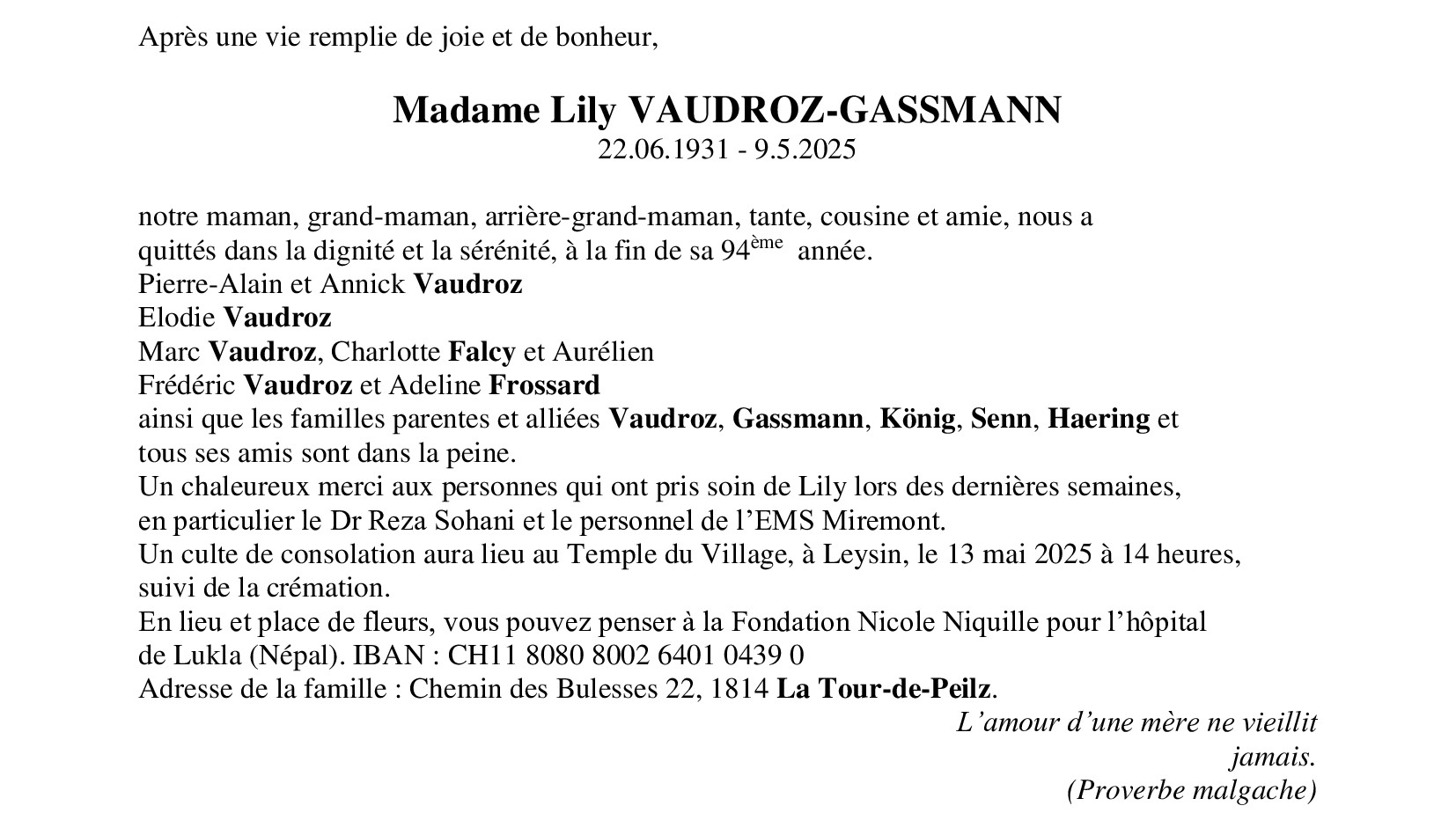 Madame Lily VAUDROZ-GASSMANN 22 juin. 1931 - 09 mai. 2025 Avis mortuaire PFG Partager sur: Galerie PreviousNext PreviousNext