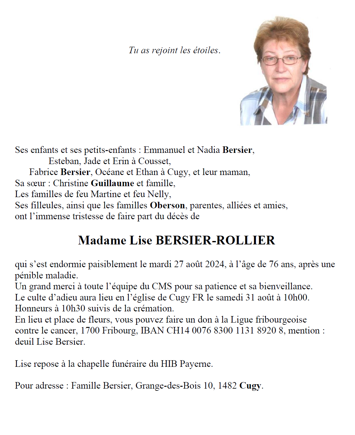 Madame Lise BERSIER-ROLLIER 04 mar. 1948 - 27 aoû. 2024 Avis mortuaire PFG Télecharger PDF Partager sur: Galerie PreviousNext PreviousNext