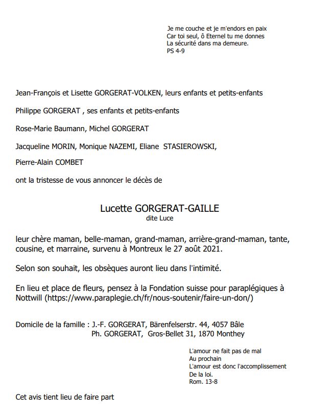 Madame Lucette GORGERAT-GAILLE 06 juil. 1924 - 27 aoû. 2021 Avis mortuaire PFG Télecharger PDF Partager sur: Galerie PreviousNext PreviousNext